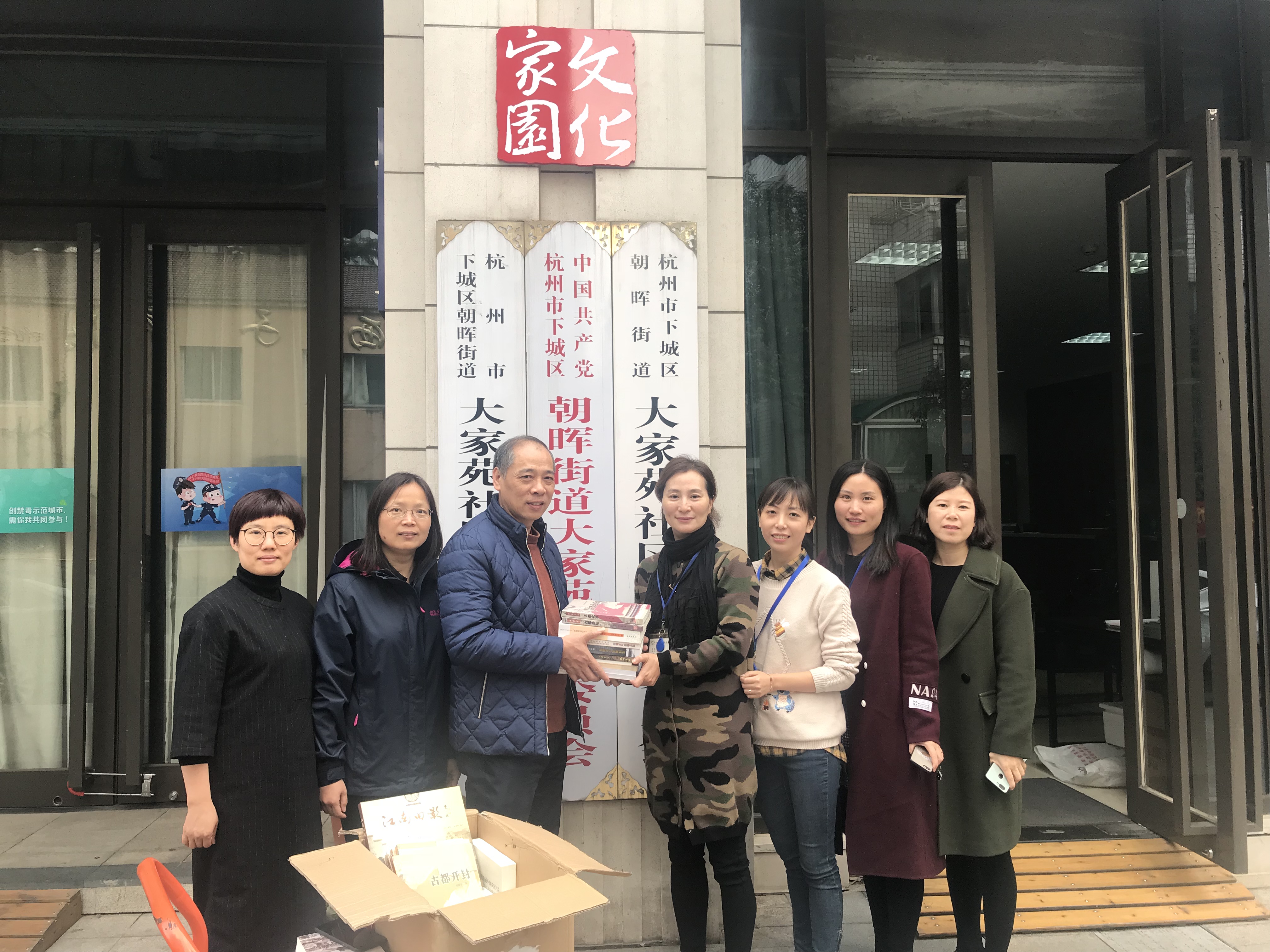 为配合做好社区文化家园建设,扎实推进“双千”结对联建活动, 2018年11月25日,杭州出版集团在朝晖街道大家苑社区文化家园设立了以“悦读杭州”为主题的杭版图书专架,共计捐赠图书300余册,重点包括《杭州全书》《西湖全书》《杭州简史》等有关杭州地域文化类图书。