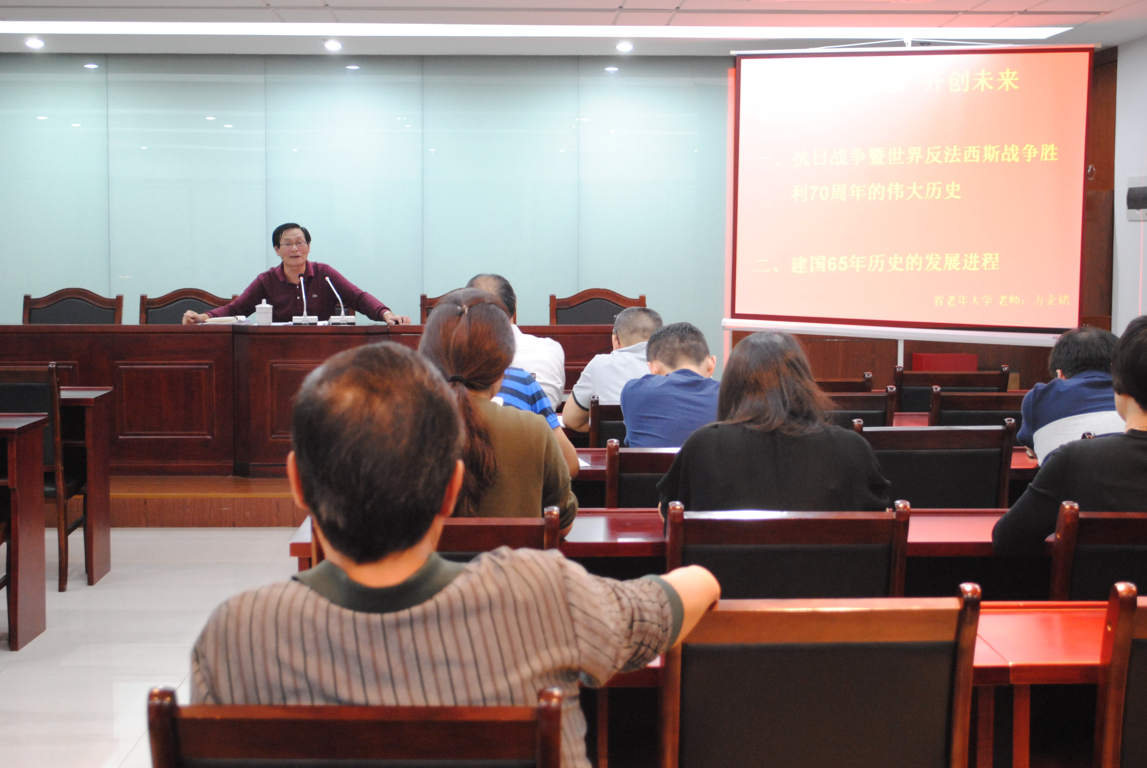 为更好地落实每月一次的“党员固定活动日”制度,9月28日,社党支部特别邀请了省老年大学方企铭老师作了题为“铭记历史,开创未来”的讲座,为大家上了一堂生动的党课。方教授通过讲解抗日战争的伟大历史和建国65年来的发展历程两个阶段,以真实的名人轶事、严谨的社会制度分析穿插其中,向大家全面地阐述了我国走中国特色社会主义道路的独特原因和历史必然性。党员们和室主任们听得津津有味,对国共两党在抗日战争中的表现,抗日战争在世界反法西斯战争中的重要作用等问题有了更深刻的认识和理解;对新中国成立65年来的历史发展,毛泽东思想、邓小平理论、三个代表、科学发展观以及十八大以来四个全面的提出等理论也有了更系统的学习和掌握。大家纷纷表示,这样的党课内容丰富而精彩,希望以后的党员活动越办越好。