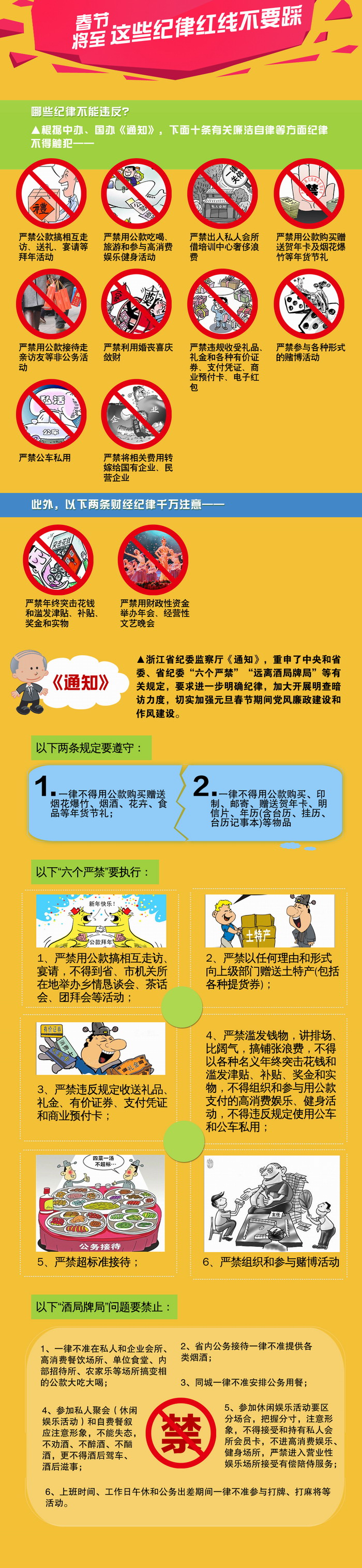 规矩立在明处,“红灯”亮在前头。2015年元旦前夕,中共中央办公厅、国务院办公厅印发了《关于做好2015年元旦春节期间有关工作的通知》,中央纪委印发了《关于加强监督执纪问责确保务实节俭过节的通知》。紧接着,浙江省纪委监察厅也印发了《关于做好2015年元旦春节期间有关工作的通知》。那么,哪些纪律是节假日的高危触点?今年,中央、浙江省和杭州市在纪律要求方面又有什么新规?