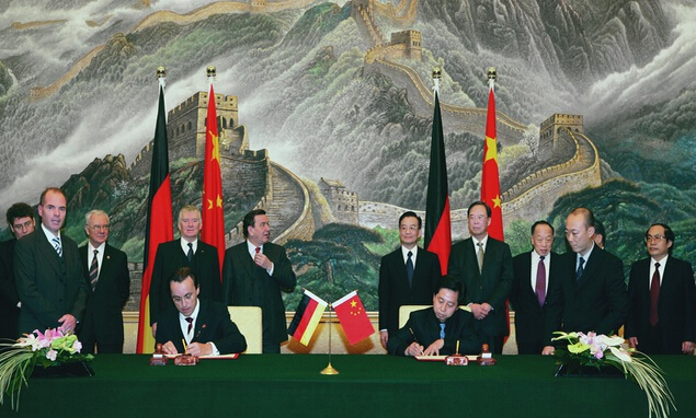 国务院总理温家宝、副总理曾培炎、外交部长李肇星等与德国总理施罗德、内政部长席列等在人民大会堂出席杭州出版社与德国阿克赛尔施普林格集团关于汽车及摩托车杂志版权许可协议谅解备忘录及双方成立合作经营公司的合作谅解备忘录签字仪式。杭州出版社总编辑徐海荣和德国阿克赛尔施普林格集团国际总裁威勒博士分别在合作谅解备忘录上签了字。