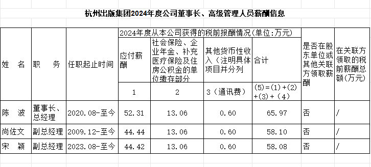 杭州出版集团2024年度公司董事长、高级管理人员薪酬信息